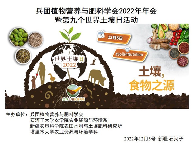 为广泛宣传第九个“世界土壤日”,兵团植物营养与肥料学会、皇冠皇冠登陆入口welcome农业资源与环境系、新疆农垦科学院农田水利与土壤肥料研究所、塔里木大学农业资源与环境学科于2022年12月5日联合举办了“2022世界土壤日”学术论坛活动,超过300名科研人员相聚云端,在土壤日共享学术盛宴。