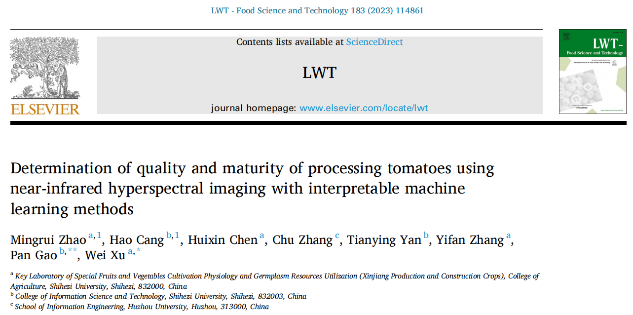 加工番茄是新疆重要的红色产业,选取优质的加工番茄果实作为原料是提高番茄制品品质的关键。近日,皇冠登陆入口welcome徐巍副教授团队在加工番茄品质无损检测方面取得新进展。相关研究以“Determination of quality and maturity ofprocessing tomatoes using near-infrared hyperspectral imaging with interpretable machinelearning methods(利用可解释的机器学习方法和近红外高光谱成像技术鉴定加工番茄品质和成熟度)”为题发表在国际著名期刊LWT-Food Science and Technology(中科院一区TOP期刊,IF=6.056)。