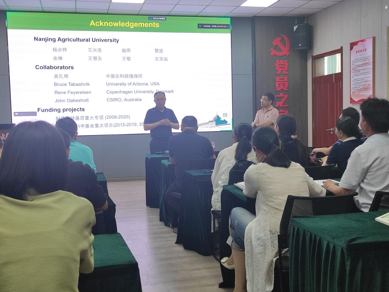 受植保系邀请,2023年7月19日国务院学位委员会植物保护学科评议组成员、南京农业大学植物保护学院吴益东教授莅临植保系指导工作,与院领导及植保系教师开展座谈,并做了精彩的学术报告。
