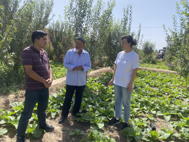 今年下半年,示范户定植了早熟四季豆、黄瓜和甘蓝,播种了大白菜,小白菜,崔金霞和敬媛媛来到示范户莫合特·热合木的小院,讲解了四季豆、黄瓜、甘蓝定植后浇水施肥管理措施,缓苗后不用天天浇水,地表土颜色变成浅黄再浇水,一次浇透,施肥时每穴施颗粒肥10粒左右,不能施多,多施产生烧苗现象。在示范户土热逊·吾布力家里指导农户秋季大白菜提早间苗、合理施肥和防虫是丰收的关键,大白菜苗小的时候容易遭虫害,每隔8-10天打一次杀虫药。部分农户的院子里,番茄已接近尾声,督促农户及时拔除,给农户提供小白菜种子,补种小白菜。
