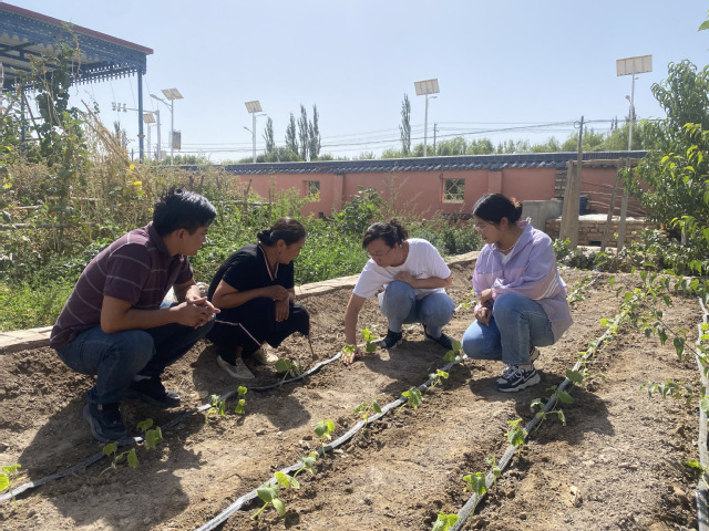 近日,我校庭院经济科技服务团队崔金霞教授、敬媛媛副教授一行来到三师53团4连,和工作队一起来到农户的庭院,对农户庭院种植蔬菜作物间苗、水肥管理进行了指导。