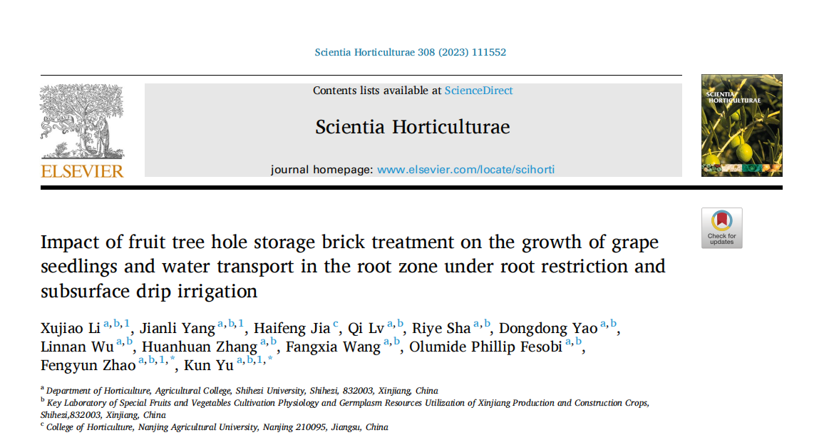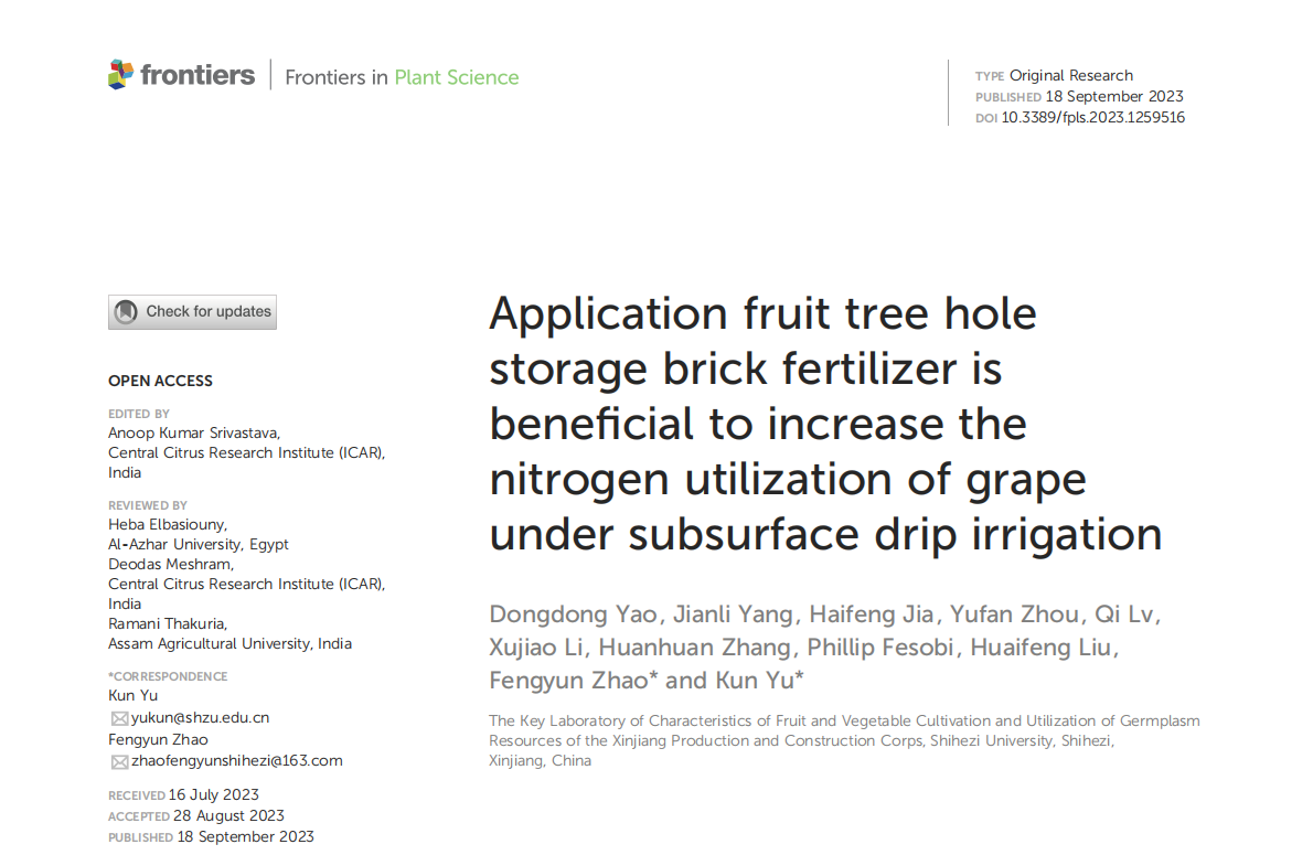 近日,我校于坤副教授在“果树穴贮砖+滴灌”提高葡萄氮素和水分利用率方面取得新进展,探讨出了果树穴贮砖耦合滴施氮肥的新型水肥一体化策略。相关研究以“Application fruit tree hole storage brick fertilizer is beneficial to increase the nitrogen utilization of grape under subsurface drip irrigation”、“Impact of fruit tree hole storage brick treatment on the growth of grape seedlings and water transport in the root zone under root restriction and subsurface drip irrigation”为题发表在国际农林TOP期刊Frontiers in plant science(JCR一区TOP期刊,IF=5.6)和Scientia Horticulturae(JCR一区TOP期刊,IF=4.3)。