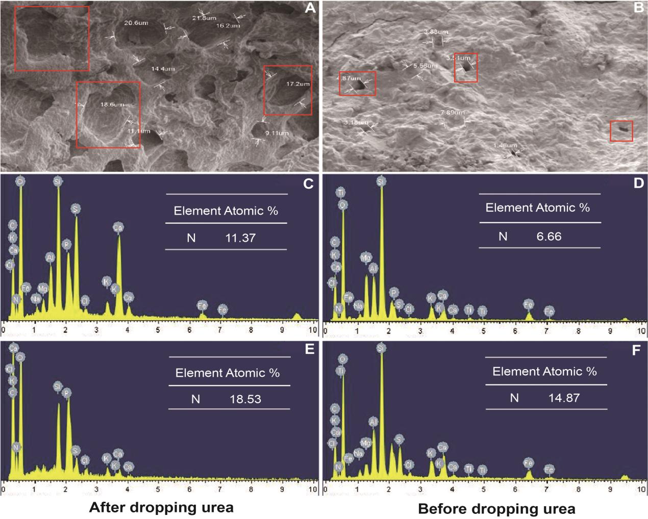 Figure 2. Different FTHSB nitrogen content before and after urea drip application. (A, B) Scanning electron micrographs exhibit different porosity for these two types of bricks with pore sizes, Red frame on pictures show the different pore sizes in FTHSB A and FTHSB B. (C) nitrogen content in FTHSB B after dripping urea.(D) nitrogen content in FTHSB B before dripping urea. (E) nitrogen content in FTHSB A after dripping urea. (F) nitrogen content in FTHSB A before dripping urea.