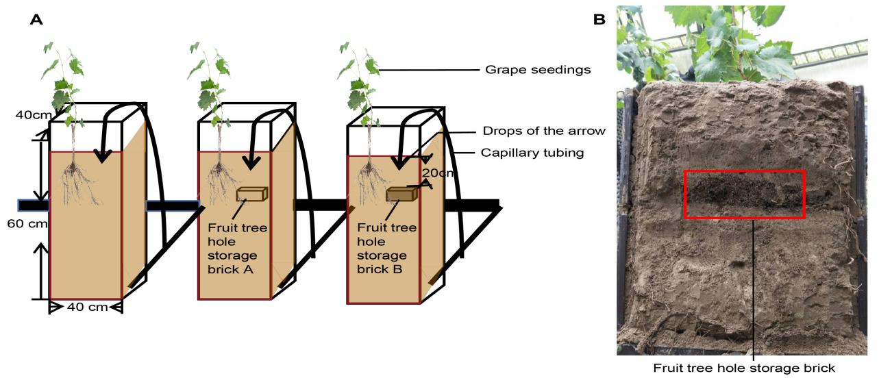 Figure 1. Experiments’ design of this study. Pattern diagram of cultivation mode the three treatments(A). picture of placement fruit tree hole storage brick in box(B) .