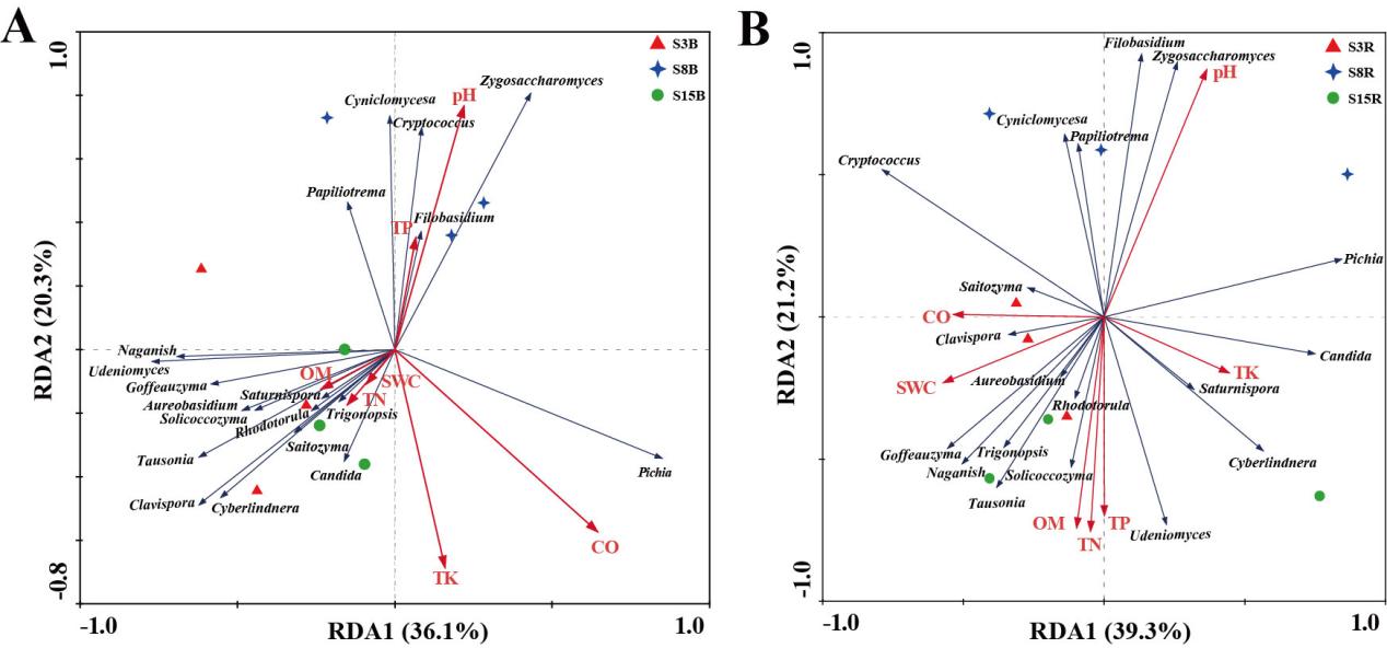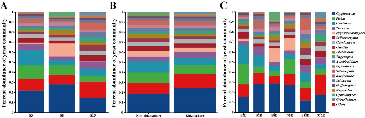 Proportion of dominant yeast genera of soil samples from non-rhizosphere and rhizosphere of 3-year-old (S3), 8-year-old (S8), and 15-year-old (S15) peach trees.