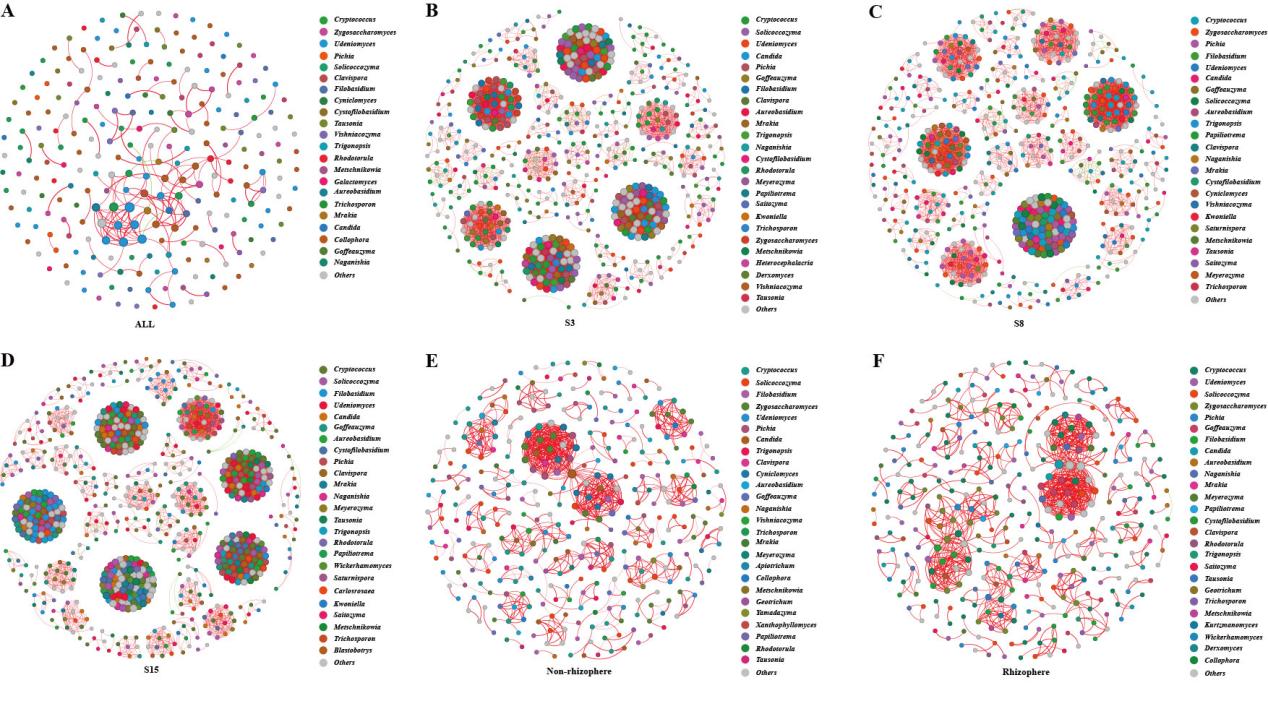 该研究利用Illumina MiSeq高通量测序技术,对桃园中种植年限分别为3年、8年和15年桃树的非根际和根际土壤中酵母菌多样性和群落结构进行了分析。结果表明,所有土壤样品共检测到114种酵母菌属,归属于子囊菌门(60属)和担子菌门(54属)。其中Cryptococcus是最优势属。主坐标分析(PCoA)表明,酵母菌群落结构在时间尺度上的差异比空间尺度上的差异更为明显。此外,15年桃根际土壤pH值最低,而土壤有机质(OM)、总氮(TN)和总磷(TP)含量均显著增加。通过冗余分析(RDA)发现土壤pH和电导率(CO)是影响桃园土壤酵母群落结构时空变化的关键因子。利用共现网络分析,研究发现桃园土壤酵母菌网络整体上表现出协同效应,15年桃园土壤酵母菌网络在时间尺度上的相互作用程度和连接紧密度显著高于3年和8年桃园土壤酵母菌网络。上述研究结果揭示了桃园土壤中酵母菌群落的分布规律和作用机制,有助于制定有效的土壤管理策略,提高土壤微生态的稳定性,从而促进作物生长。
