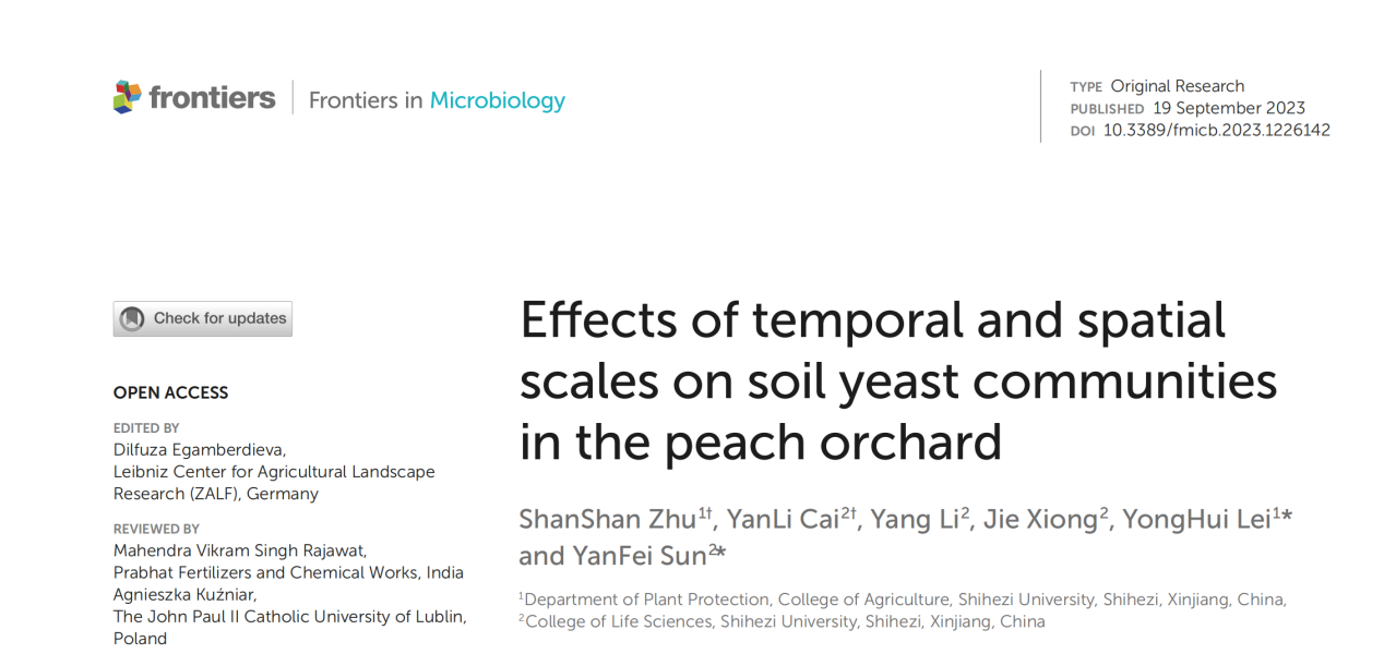 近日,皇冠登陆入口welcome雷勇辉副教授在桃园土壤酵母菌群落结构对于时间和空间的响应方面取得新进展。相关研究以“Effects of temporal and spatial scales on soil yeast communities in the peach orchard(时空尺度对桃园土壤酵母菌群落的影响)”为题发表在国际著名期刊Frontiers in Microbiology(JCR一区TOP期刊,IF=5.2)。