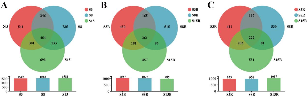 Venn diagram at the OTU level of soil samples from non-rhizosphere and rhizosphere of 3-year-old (S3), 8-year-old (S8), and 15-year-old (S15) peach trees.