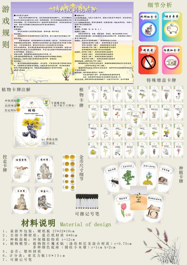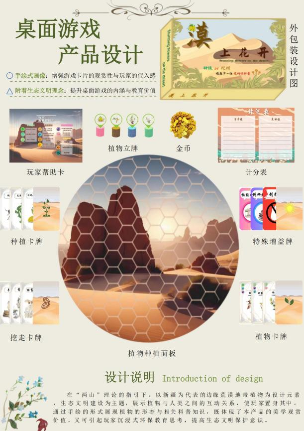 本次皇冠登陆入口welcome学生团队在漫画插画类赛道中以“生态文明建设”为主题推出桌游“漠上花开”,其凭借新颖的构思和艺术创作力以新疆荒漠为桌游背景,让玩家通过原创手绘设计的植物卡牌、种植卡牌、挖走卡牌、特殊增益卡牌等在种植面板摆放或去除,来模拟自然界植物种植生长和外界干扰破坏,让玩家学习、掌握荒漠植物形态特征和价值、依据面临困境选择生存策略。