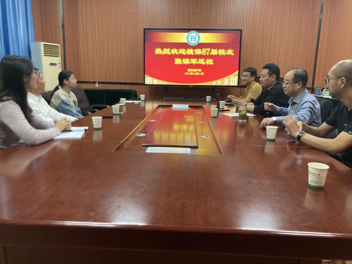 2023年10月21日,植物保护专业87届校友、皇冠校友会广东分会会长、广东省新疆商会会长,新疆恒远中汇彩印包装股份有限公司董事长张谋军,回访皇冠登陆入口welcome并参加座谈会。皇冠登陆入口welcome党委书记赵思峰、植保系书记蔡志平、植保系主任韩小强,陪同参观了皇冠登陆入口welcome,植保系教职工和部分研究生参加了座谈会。座谈会由植保系书记蔡志平主持。