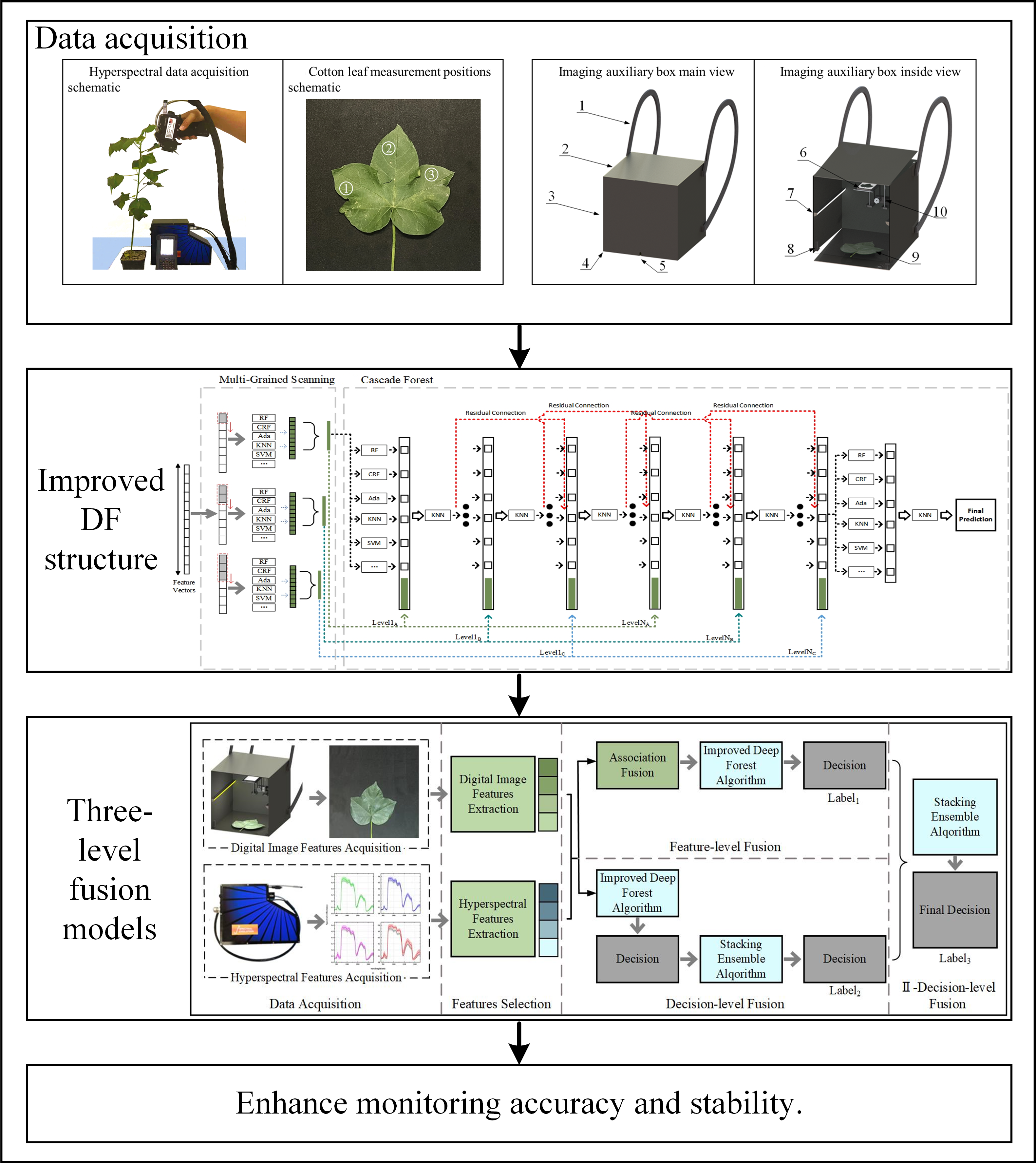 该研究以新陆早53号棉花为研究对象,开展室内盆栽实验,设置6个不同氮素处理,分别以棉叶的高光谱和数码图像为数据源,以增强表征学习能力为目标,通过在深度森林(DF)模型中的多粒度扫描和级联森林模块丰富多类别的基学习器,并在级联森林模块中添加跳跃连接策略以优化网络,提升在两个数据源中的反演质量。随后从特征级融合、决策级融合和二次决策级融合三个层次出发,构建联合DF与Stacking集成学习的“图像-光谱”融合模型,进一步提升氮含量反演的精度和稳定性。结果表明,DF模型满足农学数据获取困难、体量少的训练条件,改进的DF相较于传统机器学习模型验证集R2提升13.4%-28.5%,相较于原始DF模型验证集 R2提升10.9%-14.9%;同时,三层次“图像-光谱”融合模型相较于单一数据源最优反演模型验证集R2分别提升8.6%-9.3%,10.5%-11.2%,11.8%-12.5%。证实了改进的DF模型与三层次融合模型均能提升棉花氮含量反演精度,其中二次决策级融合模型效果最优,该方法为监测小样本作物表型参数提供借鉴和参考。