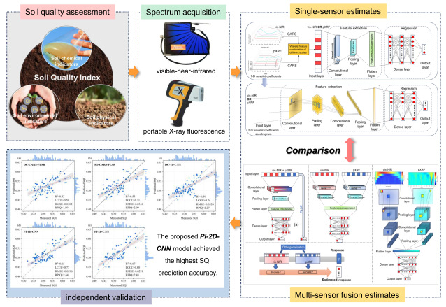 土壤质量评价作为评估管理措施及土地利用变化等人类活动对土壤影响的手段,对于实现土地资源的可持续管理至关重要。然而,由于传统的土壤质量评价方法存在成本高昂、费时费力等问题,迫切需要开发更具成本效益和时间效益的新技术来实现快速、大规模的土壤综合质量监测和可靠评估。研究团队以新疆叶尔羌河-喀什噶尔河流域作为研究区,评估了可见-近红外(vis-NIR)和便携式X射线荧光(pXRF)光谱数据融合在预测土壤质量指数(SQI)方面的潜力,并提出了一种将连续小波变换(CWT)和并行输入2D卷积神经网络(PI-2D-CNN)相结合的多源光谱数据融合新方法。结果表明:两种光谱数据融合有效改进了SQI的预测精度,与传统的光谱数据融合方式相比,基于PI-CNN的数据融合表现出明显的优越性,所提出的PI-2D-CNN模型实现了最优的SQI预测精度 (验证R2=0.67)。研究结果证明了CWT结合PI-2D-CNN模型在改进光谱数据融合SQI的潜力,可为大范围快速、无损地监测土壤质量提供一定的理论依据和技术方法。