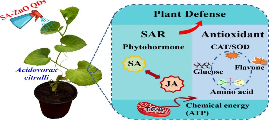 基于纳米递送系统的农药在可持续农业的发展中受到越来越多的关注。杨德松团队通过构建pH响应型水杨酸偶联氧化锌量子点系统,用于防治甜瓜细菌性果斑病。研究证明缓释系统通过增加抗氧化防御系统和养分吸收有效的预防细菌性果斑病的发生。代谢组学进一步证明了水杨酸偶联氧化锌量子点能够激活感病甜瓜幼苗的系统性获得抗性和黄酮类生物合成。上述成果以题为“A novel type of quantum-delivery system (salicylic acid conjugation based on ZnO quantum dots) alleviates the bacterial fruit blotch disease of melon plants by activating defense response”(一种新型量子递送系统(水杨酸偶联氧化锌量子点)通过激活甜瓜防御系统防治细菌性果斑病)发表在《Chemical Engineering Journal》。本研究为新疆甜瓜病害的绿色防控提供了新的思路。