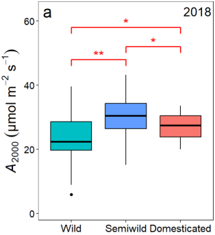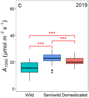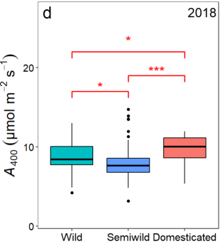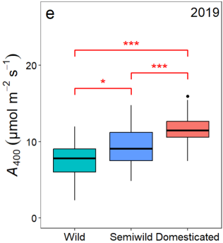 图2 比较2018年(a、d)和2019年(b、c、e)野生、半野生和栽培材料光合速率差异