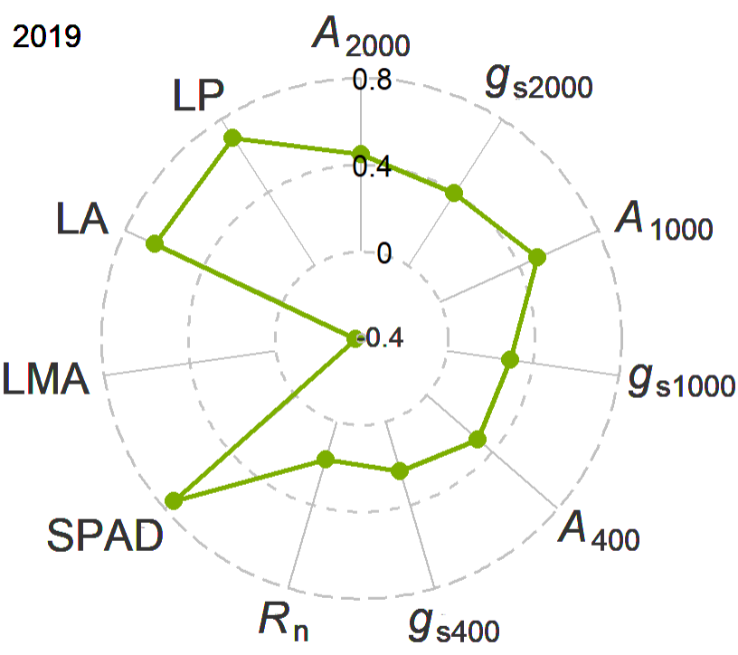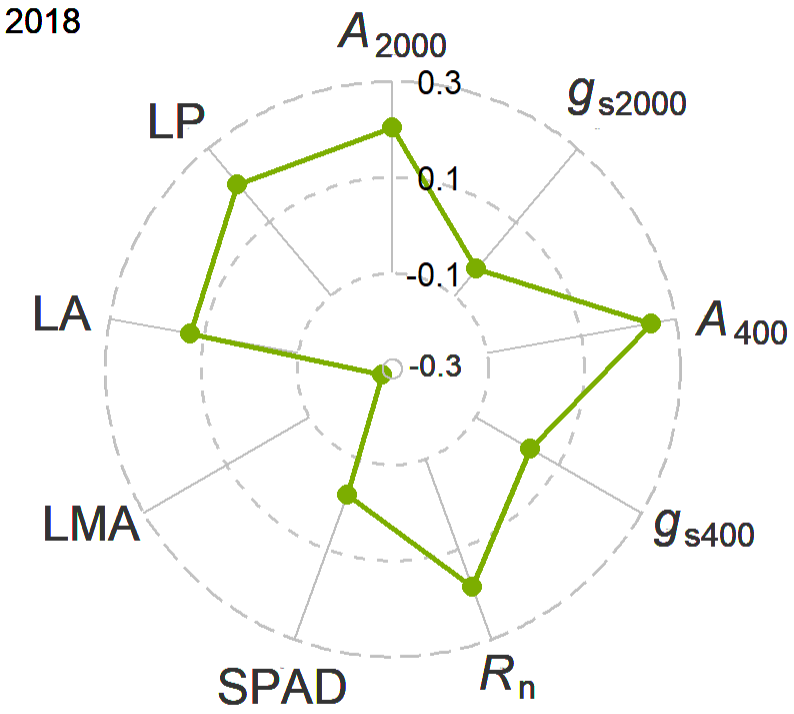图3 图示2018和2019年地上部生物量与生理和结构特征的相关系数