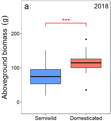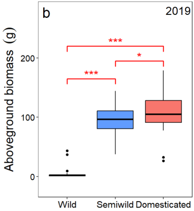 图1 比较2018年(a)和2019(b)年野生、半野生和栽培材料地上部生物量差异