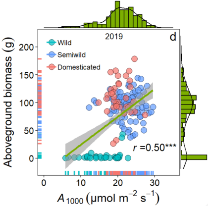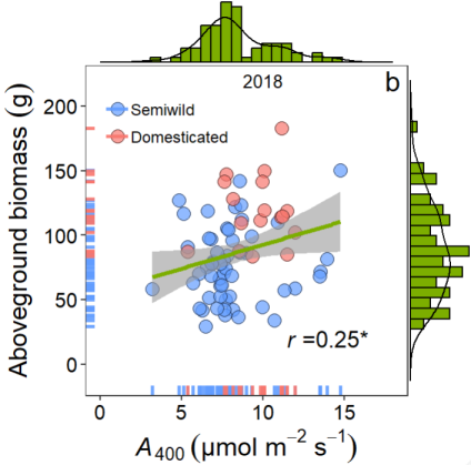 试验于2018和2019年在海南三亚国家野生棉种质资源圃进行,使用40个野生棉材料、91个半野生材料和42个栽培材料,测定高光强(2000 μmol m-2 s-1)、中光强(1000 μmol m-2 s-1)和低光强下的(400 μmol m-2 s-1)光合速率(A2000、A1000和A400)、呼吸速率、叶绿素含量、叶片形态结构和生物量。结果显示驯化第一和第二阶段生物量均显著增加(图1),同时第一阶段A2000和A1000增加,第二阶段A400增加(图2),地上部生物量与A2000和A1000、A400之间呈显著正相关关系,说明生物量增加与光合物质生产能力紧密关联(4)。此外,叶面积增大和叶绿素含量增加,可以提高光竞争能力,也是增加叶片光合和冠层碳增益的因素之一(图3)。因此,棉花驯化第一和第二阶段持续增加地上部生物量可能意味着栽培品种具有更快资源获取速率。