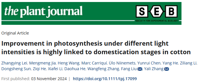 Lei Zhangying, Jia Mengmeng, Wang Heng, Carriquí Marc, Niinemets Ülo, Chen Yunrui, He Yang, Li Ziliang, Sun Dongsheng, He Ziqi, Li Xiafei, He Daohua, Zhang Wangfeng, Liu Fang, Yali Zhang. 2024. Improvement of photosynthesis under different light intensities is highly linked to domestication stages in cotton. The Plant Journal (http://doi.org/10.1111/tpj.17099)