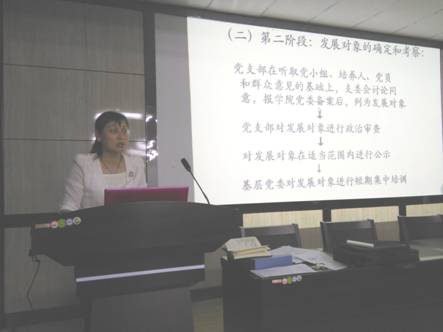 党员培训从如何发展党员;向着目标努力前进;成就一个优秀的自我三个方面展开。首先莫文萍老师详细说明了党员发展工作分为四个阶段,第一个阶段是入党积极分子确定和培养教育;第二个阶段是发展对象的确定和考察;第三个阶段是预备党员的接收;第四阶段是预备党员的教育、考察、转正。同时指出了入党的基本要求、入党积极分子推荐程序和积极分子选拔和培养细则等总体要求,她力图将入党流程讲到细致,因此还用图文并茂的方式将入党流程完整而仔细的表现出来。同学们专心听取并认真做笔记。