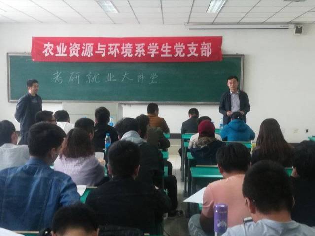 为加强资环系学风建设,使学生正确看待学习与考研,鼓励学生继续深造,资环系学生党支部联系教工党支部于2018年5月24日下午在博学楼C342举办“考研就业交流会”。资环系教工党支部书记冶军、资环系主任王海江、原资环系主任侯振安等多位老师及资环系2015级全体学生参加此次活动。