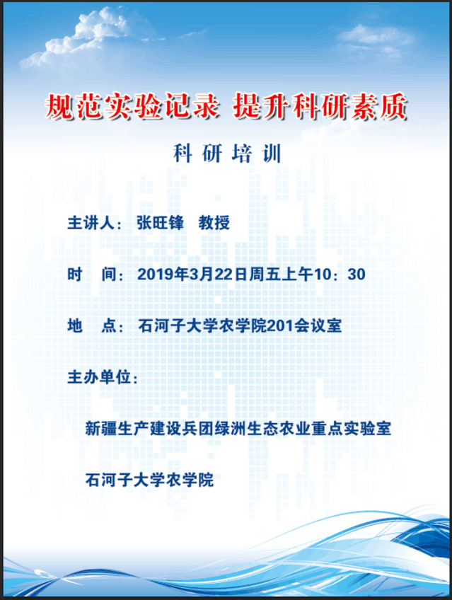 绿洲生态农业重点实验室将于本周五上午10:30邀请张旺锋教授做关于如何更好的指导研究生,如何记录好实验数据,以提高科研能力和科研素质的报告,欢迎研究生及年青导师聆听此次报告。
