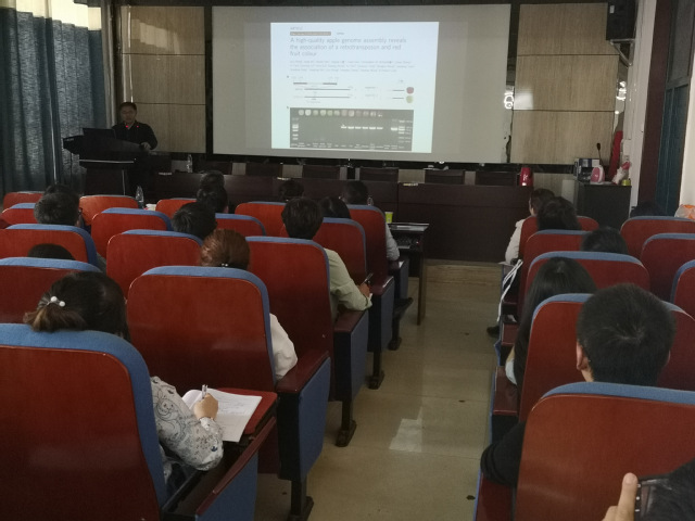 讲座以“糖和硝态氮信号调控果实品质的分子机理”为主题,重点讲授了MYB转录因子调控了花氰苷合成从而影响了苹果色泽的科学原理和研究思路。郝玉金教授通过形象的图片展示、详实的数据呈现、将高深的专业学术研究用通俗易懂陈述,形象深动的呈现给了在场师生。