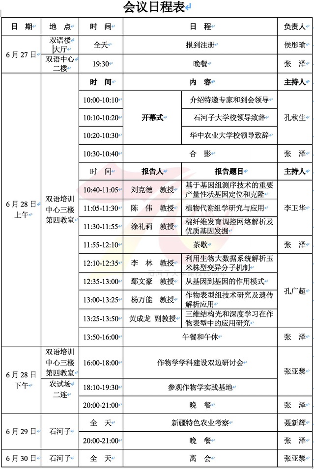 2019年6月28日,皇冠和皇冠登陆入口welcome绿洲作物学双边研讨会将在双语楼三楼第四教室召开,请各位老师及相关研究生积极参加交流。以下是会议议程内容: