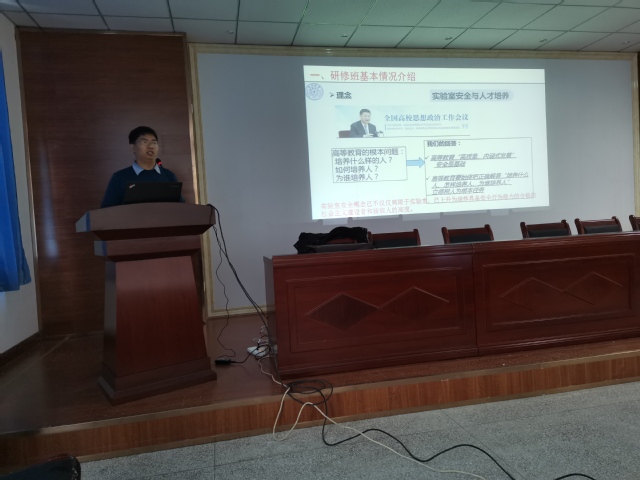 此次安全培训由高级实验师、“危化品安全管理员”李召锋老师主讲。他介绍了自己参加“2019年高校教学实验室安全管理暨应急能力建设研修班”的情况,并基于自己多年实验室管理与教学科研实验过程中的体会、思考与参会人员进行了总结和分享。