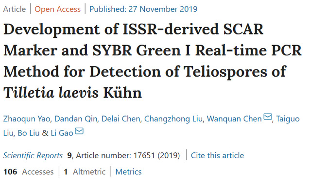 2019年11月27日,我院植保学科赵思峰教授团队姚兆群讲师与中国农科院植保所小麦病害团队合作在Nature旗下子刊Scientific Reports在线发表了题为“Development of ISSR-derived SCAR Marker and SYBR Green I Real-time PCR Method for Detection of Teliospores of Tilletia laevis Kühn”的研究论文。该论文第一作者是姚兆群讲师,通讯作者是中国农业科学院植物保护研究所高利研究员。