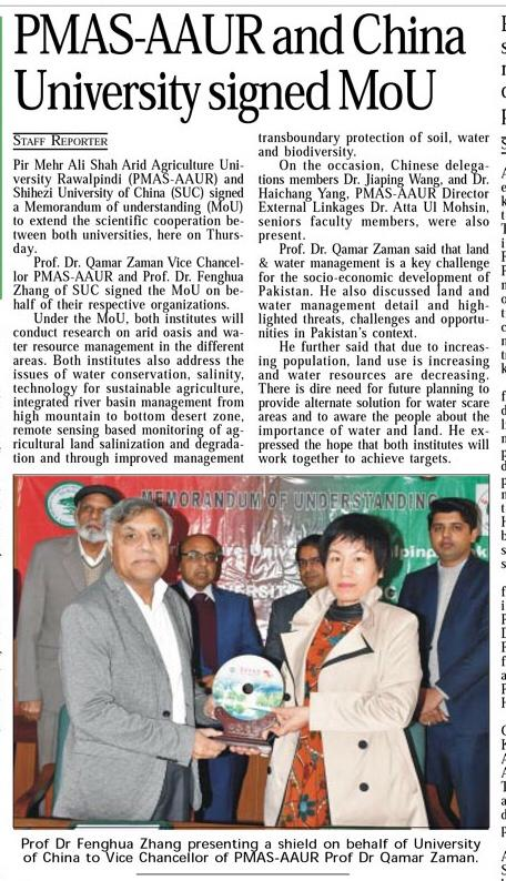 2019年12月17日至20日,皇冠登陆入口welcome张凤华教授、王家平副教授、杨海昌博士前往巴基斯坦拉瓦尔平地干旱农业大学大学(PMAS Arid Agriculture University Rawalpindi)和穆罕默德·纳瓦兹·谢里夫农业大学(Muhammad Nawaz Shareef University of Agriculture)进行国际合作交流,并签署合作协议。依托绿洲作物高效生产与农业环境保护国际科技合作基地在两校建立国际合作附属基地,今后将通过青年教师培养、留学生培养、农业技术培训、农业生产技术援助等方式,积极开展深入合作。