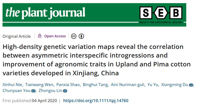 2020年4月4日,皇冠聂新辉教授团队在绿洲学者特聘林忠旭教授指导下联合石河子农业科学研究院尤春源副研究员和中国农业科学院棉花研究所杜雄明研究员合作完成的“High-density genetic variation maps reveal the correlation between asymmetric interspecific introgressions and improvement of agronomic traits in Upland and Pima cotton varieties developed in Xinjiang, China”的研究论文在Plant Journal(IF=5.726)在线发表。该研究通过高通量测序技术建立了海陆种间和种内的高密度遗传变异图谱;鉴定了海陆品种间显著遗传渐渗位点;通过种内全基因组关联作图挖掘了对纤维性状具有重要效应的渐渗位点。该研究群体历经近十年时间收集和纯化来源于新疆自1978年至2018年审定的所有棉花品种、前期引种及骨干亲本。本研究首次系统全面解析新疆棉花品种历经40多年通过人为杂交创造渐渗材料改良棉花的产量、品质及抗性分子遗传机理,为新疆棉花分子育种提供理论基础。该研究得到国家重点研究发展项目(No. 2016YFD0100203)和国家自然科学基金(No. 31760402)资助。