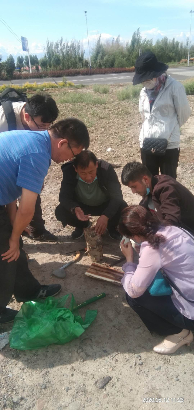 一行人员与师市森防站、伊犁绿之源森林病虫害有限公司人员进行了交流及田间走访后,了解到可克达拉市林业害虫主要以蛀干性害虫为主,食叶性害虫前期取得了较好的防治效果。蛀干性害虫通过取食树木主干的韧皮部、木质部,影响树木营养物质和水分的输送,进而造成树木的枯死,给当地林业生态建设带来了较大的经济损失。林业人员表示,由于一般的化学药剂很难渗透进树干,不仅对蛀干性害虫的防治造成了困难,还增加了受害树木的防护成本。