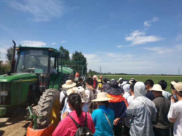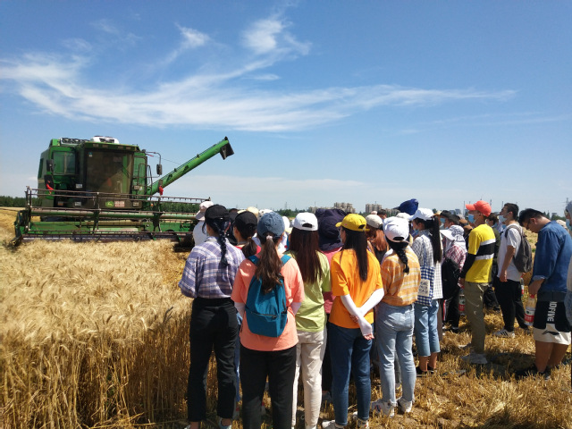 正值冬小麦收获季节,一辆约翰迪尔7610联合收割机一边追逐着金黄的涛涛麦浪,一边粉碎麦秆并吞吐麦穗芬芳。棉田也进入田间管理关键时期,一辆约翰迪尔824轮式拖拉机拖挂着喷药机刚刚完成了花铃期棉田免打顶剂和棉铃虫防治药剂的喷施作业。同学们通过参观大田管理现场,真切地体验到农业规模化、机械化和现代化生产现状。