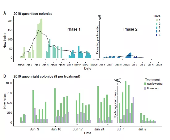 植物在适宜的条件下开花,才利于受精和种子发育正常完成,在演化过程中,开花植物建立起了一系列分子调控机制,来响应光、温等环境变化、控制开花时间。但对虫媒授粉的植物而言,却有顾此失彼的风险——它们的开花时间还需和传粉昆虫的存活期吻合。多项研究表明,人类活动导致的气候改变,正在以破坏生态互作的方式,对动植物的生存造成威胁[1]。熊蜂采食花蜜和花粉,食物来源不足时,蜂群的生存率和繁殖率显著降低,春天蜂群处于建立早期时较为脆弱,这种威胁尤甚[2];同时对依赖其传粉的植物而言,花开时缺少蜂群,成功受精的几率也大大降低。研究者观察到熊蜂工蜂有对植物叶片的损伤行为,且不以叶片为食或为筑巢材料,推测这一行为可能与之后的开花进程相关。为探究这一现象,研究人员设计了多组室内/户外实验。首先,以尚未开花的番茄(S lycopersicum)和黑芥(B.nigra)为植物材料,以商业化熊蜂蜂种B. terrestris的工蜂为昆虫材料,设计了有蜂群处理组、人为模拟损伤组和无损伤对照组,统计发现蜂群有持续地损伤植物叶片的行为,被蜂群损伤的植物,其开花时间分别较无损伤组、人工损伤组提前30天、25天(番茄)和16天、8天(黑芥),证明熊蜂损伤确实能改变植物花期。进一步,以饲喂花粉和不饲喂花粉的熊蜂蜂群为对照,统计它们对未开花黑芥的损伤行为,发现在花粉匮乏的情况下,熊蜂对叶片的损伤行为显著增加。以上室内试验证明,熊蜂损伤叶片的行为受花粉匮乏的诱导而大量增加,该行为能促进植物提早开花;然而在自然条件下,当更远处有其他花粉来源时,熊蜂是否仍会损伤临近植物的叶片来促其早花?随自然环境中花粉来源增多,该损伤行为是否减少?为探究以上问题,研究者进一步开展了三次田间试验,增加了植物种类、蜂群种类和环境条件种类,最终证实熊蜂工蜂对植物叶片的损伤行为总是存在,当环境中缺少花粉来源时,损伤活动频繁,当种群旁或周遭更远处(约20米)环境中花粉来源充足时,损伤行为均显著减少(图2)。Consuelo De Moraes教授课题组来自苏黎世联邦理工学院 (ETH Zurich)-系统环境科学系 (Department of Environmental Systems Science),主要研究方向为植物-植物/植物-昆虫种间互作的行为模式和化学信号。开花植物和授粉昆虫经漫长的协同演化,才有了契合的发育周期和互作方式,但如今,全球变暖导致的气候异常愈益频繁,该文研究结果显示,熊蜂找到了一定程度上克服困难的方法,但其他蜂类,如蜜蜂等,并未被观察到有类似行为。众多我们赖以生存的植物需异花授粉,而昆虫是异花授粉最重要的媒介。气候变化可能以更多意料之外的方式破坏现有的生态平衡,延缓气候变暖、探究动植物应对机制、寻找改善方法尤其重要。