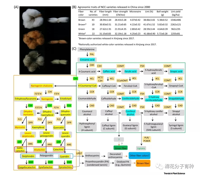 Figure 1. Breeding Progress of Naturally Colored Cotton (NCC) in China and Biosynthesis Pathways Related to NCC Pigmentation.