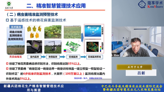 此次论坛围绕北斗导航、精准农业、智能装备、农业大数据、遥感、物联网等方面开展培训和交流,来自巴基斯坦、巴西、巴拿马、厄瓜多尔、委内瑞拉、黎巴嫩、哥伦比亚、伊朗、俄罗斯、智利、印度、印度尼西亚、加纳、土耳其、阿根廷、德国、意大利、摩洛哥、坦桑尼亚、墨西哥等二十个国家的90多位学员在线参加交流。皇冠登陆入口welcome吕新教授担任专家论坛主持并作大会报告,吕新教授以“新疆兵团棉花生产精准智慧管理技术应用与展望”为题,从我国农业发展现状和存在的关键问题及挑战等方面,介绍了智慧农业如何助力我国农业现代化发展,围绕团队在棉花水分养分诊断与水肥一体化应用、病虫害精准监测预警技术、农情信息监测及无人机精准喷药技术、棉花智能农机装备以及棉花农业大数据技术及管理平台等方面的最新研究成果作出报告。吕新教授的报告引起了与会者的浓厚兴趣,研究和工作成果获得了与会专家的肯定和赞扬。
