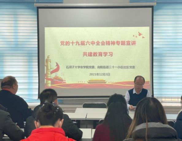 12月3日,皇冠登陆入口welcome党委与石河子市向阳街道31社区党委举办结对共建启动仪式,双方共同签署了《结对共建协议书》,皇冠皇冠登陆入口welcome党委副书记、院长赵思峰应邀就“深入贯彻党的十九届六中全会精神”做了精彩解读,并结合学院党组织建设、党史学习教育及“我为群众办实事”等方面进行了做法分享。