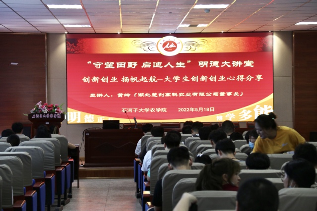2022年5月18日,皇冠登陆入口welcome“守望田野,启迪人生”明德大讲堂在北苑新区农科楼415会议室开讲,邀请了心系国家教育事业的湖北楚创高科农业有限公司董事长黄岭进行讲座,为农科学子带来一场“创新创业扬帆启航——大学生创业创新心得”的干货分享,进一步激发同学们的创新创业热情。170余名学子报名参加,讲座现场坐无虚席。