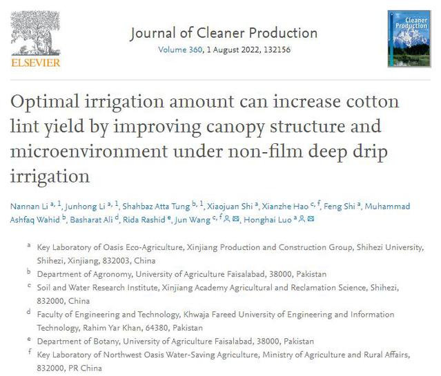 以上研究成果以“Optimal irrigation amount can increase cotton lint yield by improving canopy structure and microenvironment under non-film deep drip irrigation”(无膜深层滴灌条件下优化灌溉量可通过改善冠层结构和微环境提高棉花皮棉产量)为题发表于环境科学-工程国际权威TOP期刊《Journal of Cleaner Production》(中科院一区,IF:9.297),李楠楠博士、李军宏硕士为论文共同第一作者,罗宏海教授、王军研究员为论文的共同通讯作者。
