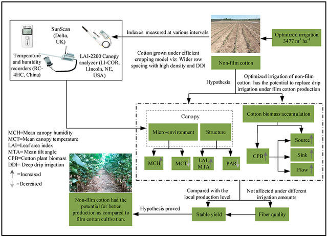 结果表明,深层滴灌条件下优化灌溉量可以增加棉花叶面积指数和叶倾角,补偿无膜棉花栽培对冠层结构的负面影响。通过冠层特性与产量的相关分析发现,皮棉产量取决于冠层中上部光合有效辐射,提出了干旱区无膜棉花高效栽培的新思路,为棉花绿色可持续生产提供理论依据和技术支持。