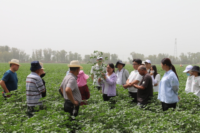 科技讲座结束后,在连队书记靳义科的带领下,实践团队与连队职工和农户代表一同来到新品种棉花示范种植基地,对棉花的实际生长情况进行调查。聂新辉老师从棉花品种选择、棉桃数目、病虫害防治等方面向连队职工和农户分析了当前棉花生长情况,深入浅出地讲解了棉花人工打顶与化学打顶的优缺点。团场职工纷纷表示,通过科技讲座、田间讲解、实地观察,学到了新知识、新技术。
