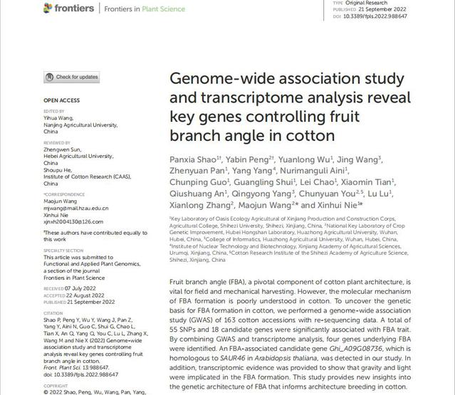Frontiers in Plant Science一文中,研究者利用重测序数据对163份陆地棉进行全基因组关联分析,共检测55个SNPs和18个候选基因与果枝夹角显著相关。结合果枝夹角极端材料的转录组分析,鉴定出4个与果枝夹角相关的基因。进一步通过表达量及功能注释分析确定了一个重要的候选基因Ghi_A09G08736,与拟南芥SAUR46同源。此外,转录组学分析表明,重力和光信号通路参与果枝夹角的形成。该研究通过分析影响棉花果枝夹角的关键因素,初步挖掘了调控棉花果枝夹角的关键基因,为株型优良的棉花定向培育与株型育种提供了重要的候选基因及理论基础。