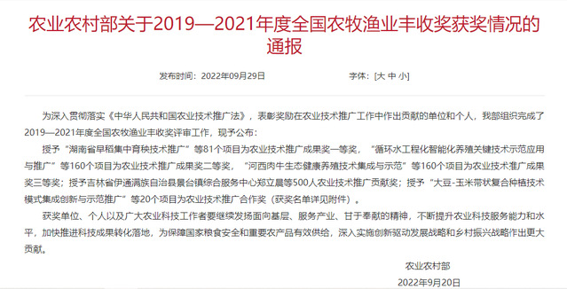 2022年9月20日,农业农村部公布了2019-2021年度全国农牧渔业丰收奖评审结果,授予“湖南省早稻集中育秧技术推广”等81个项目为农业技术推广成果奖一等奖,“循环水工程化智能化养殖关键技术示范应用与推广”等160个项目为农业技术推广成果奖二等奖,“河西肉牛生态健康养殖技术集成与示范”等160个项目为农业技术推广成果奖三等奖。