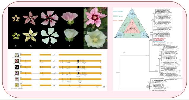 图1.棉花粉色花冠表型、GhPF基因结构及进化分析