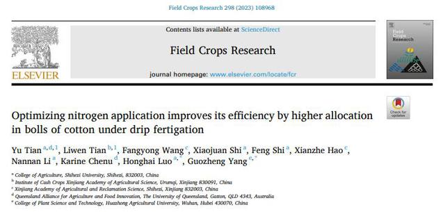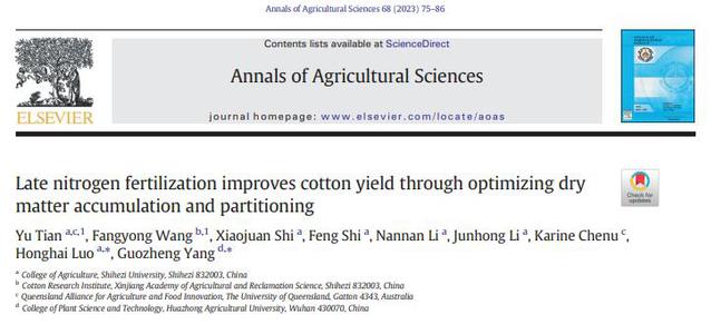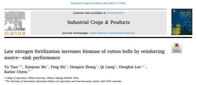 近日,皇冠登陆入口welcome棉花高产优质栽培理论与技术创新团队罗宏海教授研究小组联合新疆农垦科学院、皇冠和澳大利亚昆士兰大学在棉花氮高效利用研究中取得新进展,相继在农林科学领域TOP期刊《Field Crops Research》(中科院一区,IF:5.8)、《Industrial Crops and Products》(中科院一区,IF:5.9)和《Annals of Agricultural Sciences》(中科院一区,IF:5.9)上分别发表题为“Optimizing nitrogen application improves its efficiency by higher allocation in bolls of cotton under drip fertigation” (滴灌施肥条件下优化氮素施用可通过较高的棉铃氮分配提高其利用效率)、“Late nitrogen fertilization increases biomass of cotton bolls by reinforcing source–sink performance” (较晚的氮肥通过增强棉花源-库性能增加了棉铃生物量)和“Late nitrogen fertilization improves cotton yield through optimizing dry matter accumulation and partitioning”(较晚的氮肥通过优化干物质积累与分配改善了棉花产量)的系列研究论文。