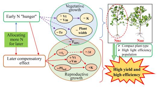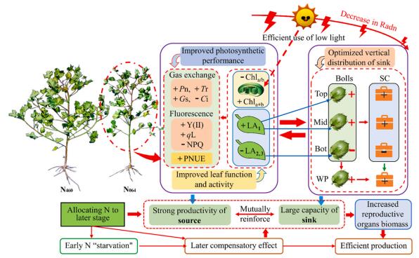 研究发现在等行距密植减氮(240 kg ha-1)栽培下,适度推迟氮肥施用有利于塑造的更加紧凑株型,保持生育后期具有更强的光合性能,并更加高效地将更多的光合产物转运到生殖器官,从而增加库容量并协同氮素积累,最终提高棉花产量和改善氮利用效率,为新疆棉花高效可持续生产提供了一种新的氮肥管理策略。