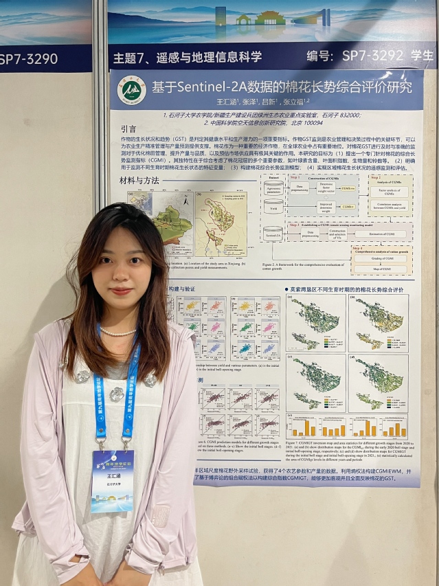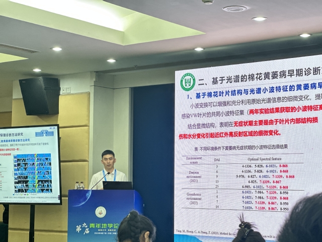 皇冠登陆入口welcome“绿洲现代农业精准技术研究与规模化应用”创新团队多名师生参加了本次论坛,其中杨秘博士以《基于遥感技术的棉花黄萎病早期诊断方法研究》为主题进行了学术报告,马怡茹博士以《基于无人机多光谱和RGB图像的机采棉脱叶效果综合评级和监测模型构建研究》为题进行了学术报告,姚秋双博士以《基于高光谱成像技术的棉花叶片钾含量监测与诊断研究》为主题进行了学术报告,王汇涵博士以《基于Sentinel-2A数据的棉花长势综合评价研究》为主题张贴报告分享了研究成果,姚秋双博士获得最佳青年报告荣誉。