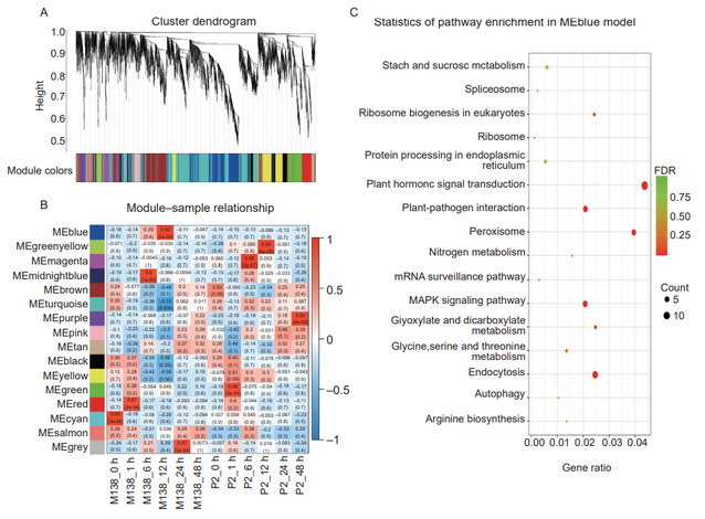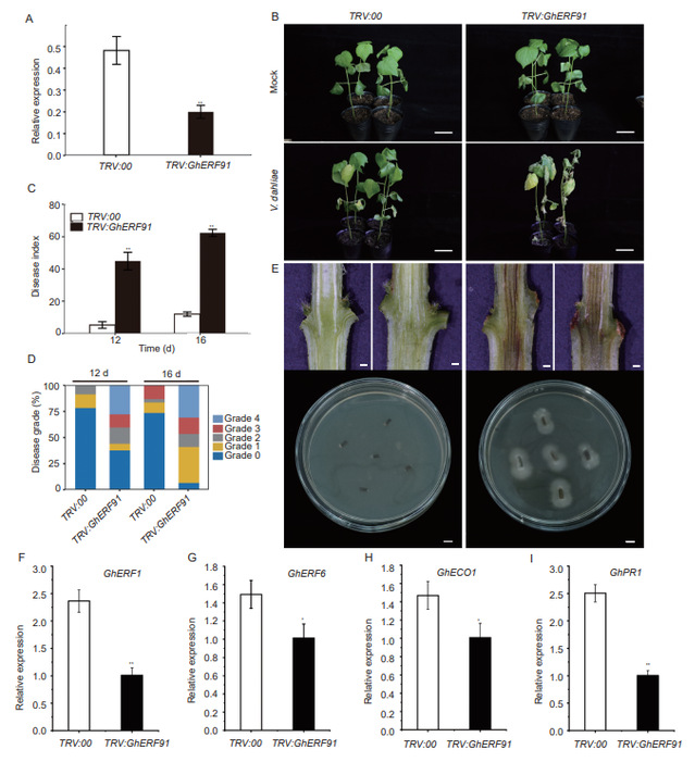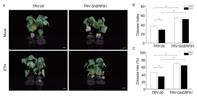 本研究团队通过8亲本构建的MAGIC群体田间多环境抗病性鉴定筛选了一个抗黄萎病MAGIC株系和感黄萎病MAGIC亲本。同时,在室内对株系进行黄萎病抗性鉴定,发现大田和室内抗黄萎病表型一致。随后对其根部侵染黄萎病菌后测转录组,分析发现差异表达基因富集苯丙氨酸代谢通路中。诱导表达分析表明,GhERF91能够被乙烯利诱导表达。沉默GhERF91表达减弱棉花对黄萎病菌的抗性。同时,我们发现GhERF91沉默植株中,乙烯信号通路关键基因GhERF1、GhERF6、GhACO1和GhPR1下调表达。更有趣的是,对GhERF91沉默植株和对照植株接种黄萎病菌前喷施乙烯利,能够增强沉默植株对黄萎病菌的抗性,反而对照植株没有明显差异。这项研究结果也证实了乙烯在棉花防御黄萎病信号通路中要的作用。