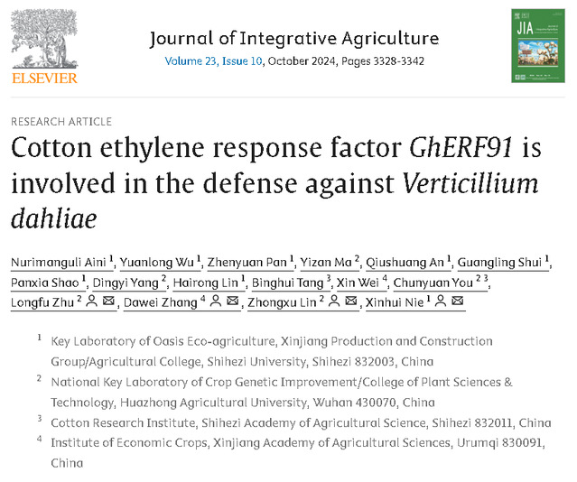 近期,皇冠棉花遗传改良团队聂新辉教授课题组完成的题为“Cotton ethylene response factor GhERF91 is involved in the defense against Verticillium dahliae” 的研究在Journal of Integrative Agriculture (《农业科学学报》(英文),JIA) 2024年10期正式发表。